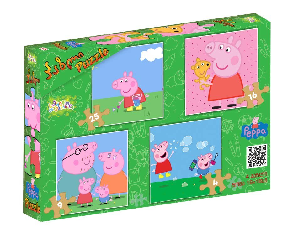 სამაგიდო პაზლების ნაკრები, რომელიც შეიცავს 4 სხვადასხვა სირთულის პაზლს (4, 9, 16 და 25 ნაჭერი). თითო პაზლი წარმოდგენილია 16×16 სმ ზომაში, მაღალი ხარისხის მუყაოზე დაბეჭდილი ფერადი ილუსტრაციით. იდეალურია ბავშვებისთვის ფერების, ფორმების და ყურადღების განვითარებისთვის.