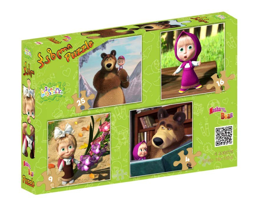 სამაგიდო პაზლების ნაკრები, რომელიც შეიცავს 4 სხვადასხვა სირთულის პაზლს (4, 9, 16 და 25 ნაჭერი). თითო პაზლი წარმოდგენილია 16×16 სმ ზომაში, მაღალი ხარისხის მუყაოზე დაბეჭდილი ფერადი ილუსტრაციით. იდეალურია ბავშვებისთვის ფერების, ფორმების და ყურადღების განვითარებისთვის.