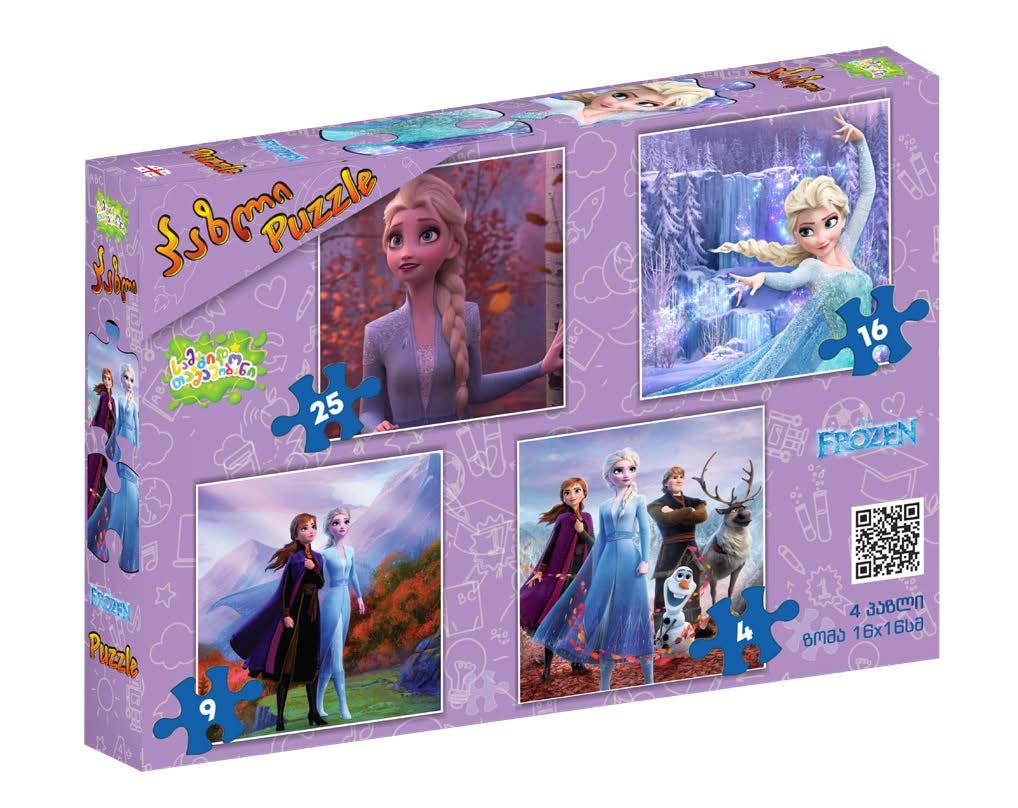 სამაგიდო პაზლების ნაკრები, რომელიც შეიცავს 4 სხვადასხვა სირთულის პაზლს (4, 9, 16 და 25 ნაჭერი). თითო პაზლი წარმოდგენილია 16×16 სმ ზომაში, მაღალი ხარისხის მუყაოზე დაბეჭდილი ფერადი ილუსტრაციით. იდეალურია ბავშვებისთვის ფერების, ფორმების და ყურადღების განვითარებისთვის.